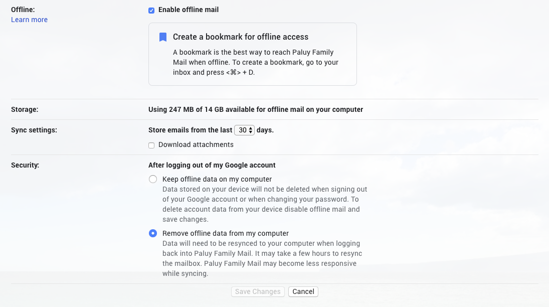 If you work with Chrome browser and don’t have any super sensitive information in your email, you should enable this feature. It will download emails locally into your browser. I recommend removing offline data after logging out.
